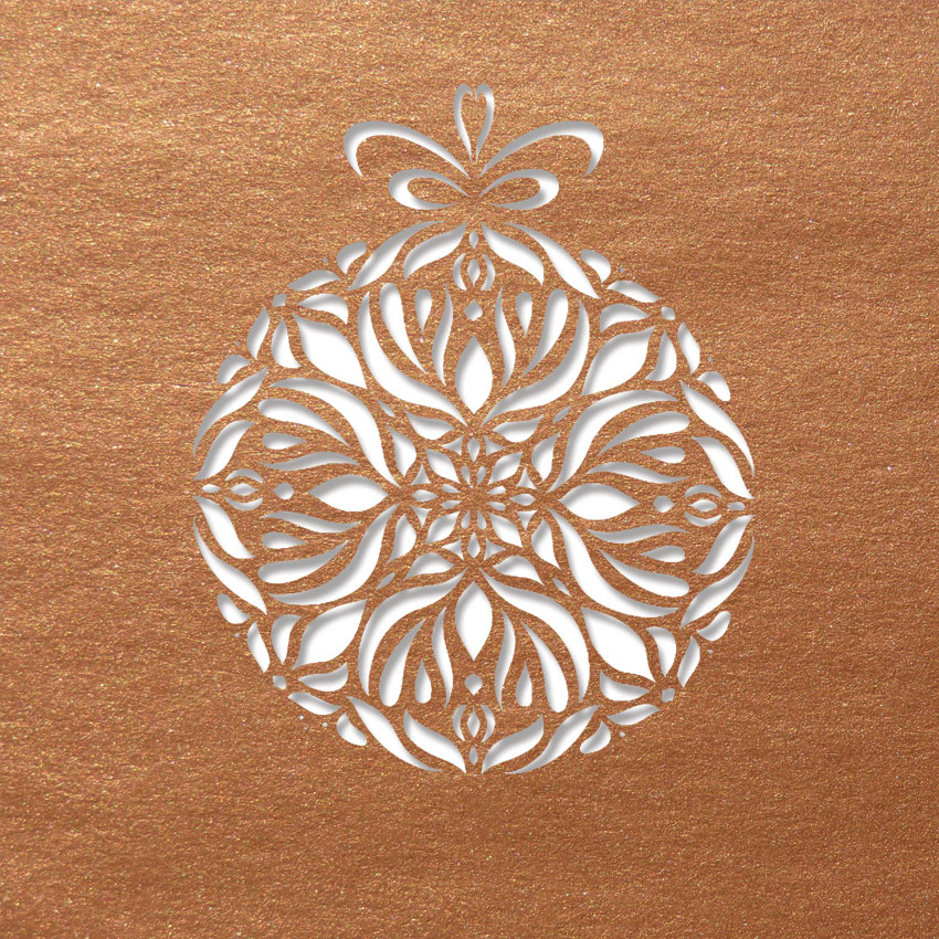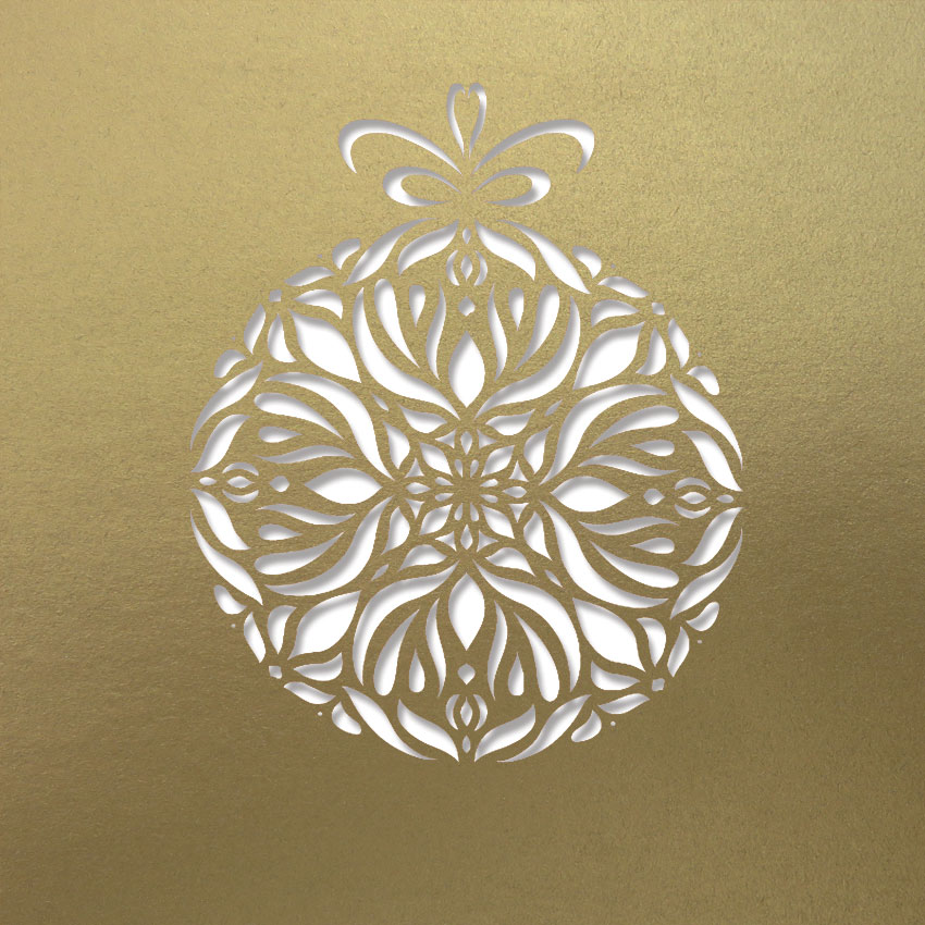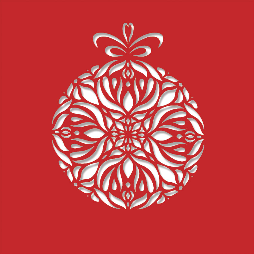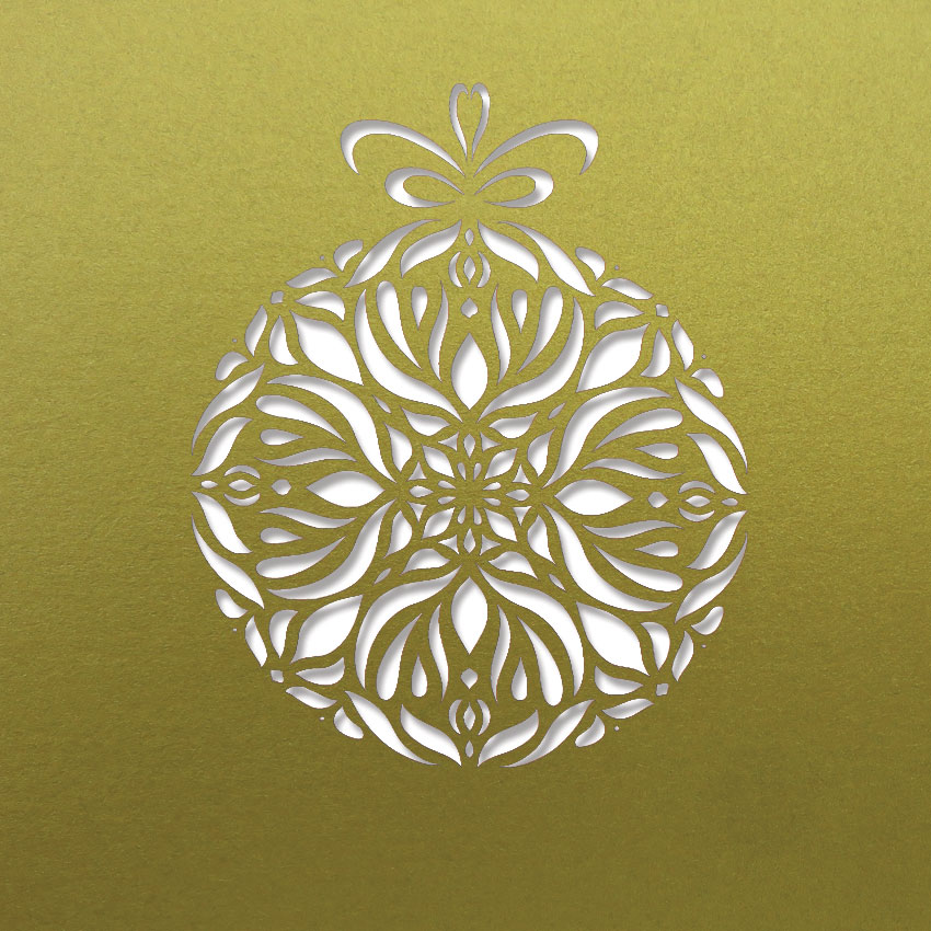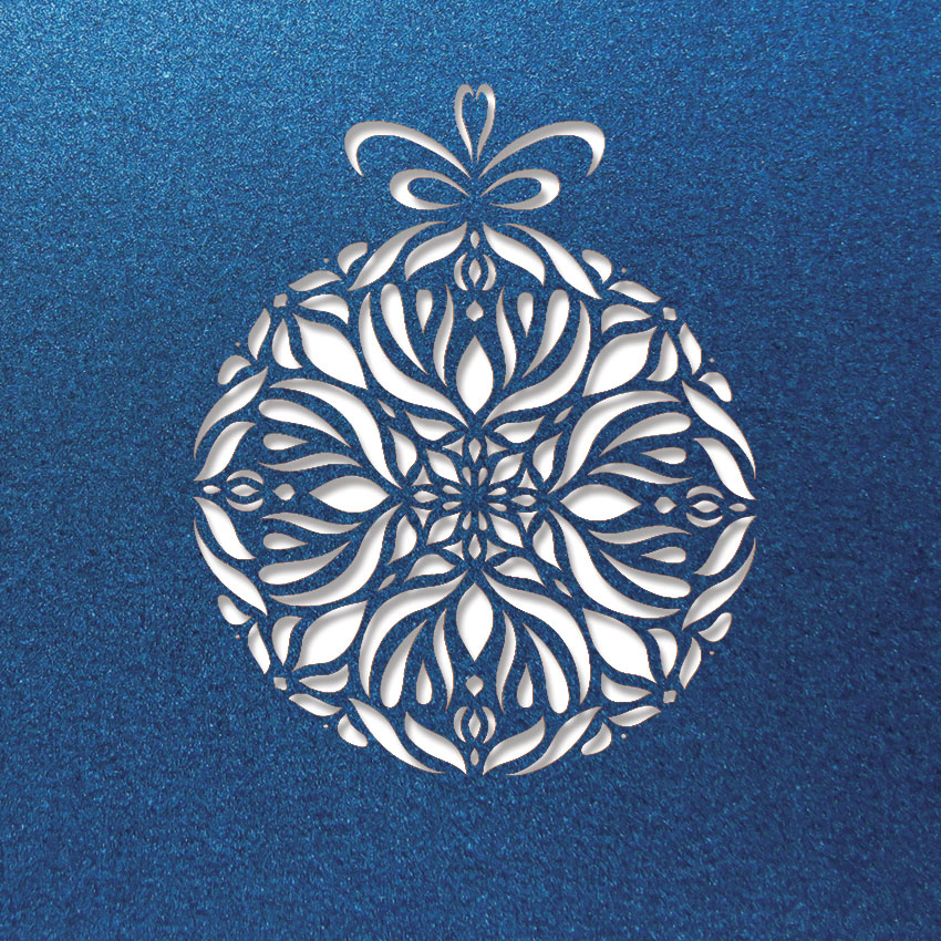 Christmas Bauble – Bespoke Laser Cut Christmas Card available in a range of spectacular colours. Cut from a premium quality, hand chosen, specialty artboard in the colour of your choice and ranging from 240gsm – 320gsm, these extra special designs are designed specifically for the corporate market – Hand finished with a quality diamond white or cream, 120gsm insert and finished to the highest standards. Options include the addition of your logo, laser cut anywhere on the card. Other colours are available upon request and are quoted for separately, please email mail@pipedreamchristmascards.co.uk for more information.